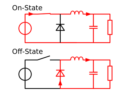 نلاحظ من الشكل أعلاه إن توصيل المصدر إلى الدائرة (عندما تقوم وحدة التحكم بغلق الترانزستور) سيتسبب بسريان التيار عبر الملف إلى الحمل. إن وجود الملف هنا يساعد على منع تغير التيار المار بشكل مفاجيء في حين تساعد المتسعة المربوطة على التوازي مع الحمل على الحفاظ على مستوى الفولتية مستقر نسبياً. أما عند فصل مصدر الفولتية عن الدائرة فإن الملف سيقوم بتفريغ الطاقة المخزنة به عبر الحمل و الدايود كما موضح في الصورة, لذلك فإن الفولتية و التيار المجهزة للحمل ستكون مستقرة بشكل قريب جدا مما لو كانت مربوطة إلى مصدر DC مباشر.