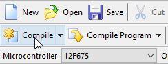 بعد الانتهاء من كتابة البرنامج, يجب الآن الحصول على ملف يحتوي على الأوامر بصيغة يمكن للمتحكم فهمها و تنفيذها. يمكن الحصول على هذا الملف بصيغة hex عن طريق الضغط على Compile في بيئة التطوير PBP.