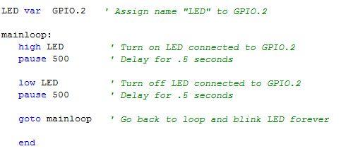 كما تلاحظ من رسم الدائرة فإن الـLED مرتبط بالنقطة رقم 5 وهو GPIO.2 كما موضح في بيانات المتحكم. سنقوم بالرمز إلى النقطة GPIO.2 بالرمز LED عن طريق كتابة الأمر LED var GPIO.2. نحن الآن بحاجة إلى حلقة غير منتهية تقوم بتشغيل الـLED لفترة معينة ثم إطفاؤه لفترة اخرى. للحصول على حلقة غير منتهية, سنقوم بوضع عنوان عند بداية الأوامر المطلوب تكرارها ليكن mainloop ثم نقوم بالعودة إليه عند نهاية تنفيذ الأوامر. ستكون الأوامر بسيطة جداً خصوصا مع بيئة العمل PBP, الأمر الأول high LED سيقوم برفع مستوى الفولتية على النقطة GPIO.2 الى مستوى VCC (5 Volts) مما سيؤدي إلى تشغيل الـLED. نقوم الآن بكتابة الأمر pause 500 و الذي سيقوم بتأخير تنفيذ الأمر التالي بمقدار 500 ملي ثانية (نصف ثانية). بعد ذلك نقوم بكتابة الأمر low LED الذي سيقوم بخفض الفولتية على النقطة GPIO.2 الى صفر فولت مما سيؤدي إلى إطفاء الـLED نقوم بعده بتأخير تنفيذ الأمر التالي بمقدار نصف ثانية اخرى عن طريق الأمر pause 500. تقوم الأوامر السابقة بتشغيل الـLED نصف ثانية ثم إطفاؤه لنصف ثانية اخرى, نحتاج الآن إلى تكرار تلك الاوامر بشكل دائم عن طريق إعادة البرنامج إلى العنوان الذي قمنا بتحديده باستخدام الأمر goto mainloop.