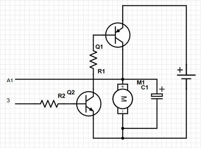 إن قاعدة الترانزستور Q2 (من نوع NPN) مربوطة إلى المخرج رقم 3 في الآردوينو عن طريق مقاومة لذلك فعندما تكون فولتية المخرج 3 في الآردوينو مساوية إلى صفر فولت لن يمر أي تيار من القاعدة إلى الباعث مما يجعل التيار المار في الجامع صفر أمبير لأن الترانزستور سيكون بانحياز عكسي. بالتالي فإن الترانزستور Q1 لن يسمح بمرور التيار إلى الحمل لأن تيار القاعدة يساوي صفر أيضا.